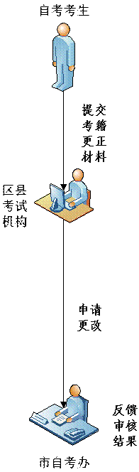 区县考试机构核验考籍更正材料原件无误后,将审核通过的更正材料扫描或拍照成电子图片,通过信息管理系统上传,提交市考办审核,经市考办审核通过的予以更正。