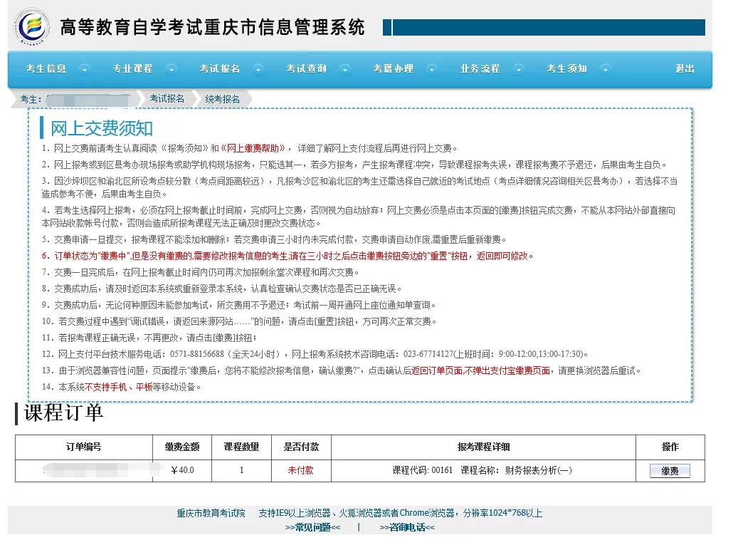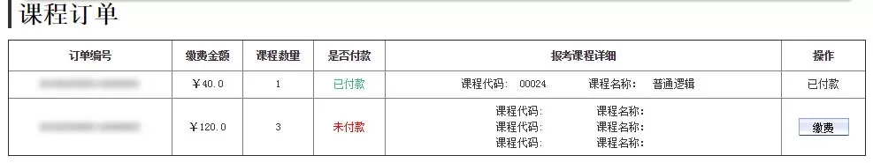 7.已完成交费课程不能进行修改,同堂只能报考一门课程。