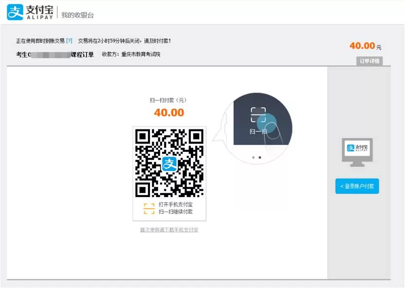 10.支付注意事项:网上报考截止时间前,完成网上交费,否则视为自动放弃。缴费完成,报考课程不能再更改。系统跳转到支付宝页面并输入支付宝账号密码后后,若未完成支付,订单将在3小时后关闭;若需要重新缴费或者更改报考课程,请于3小时后重置后再操作。