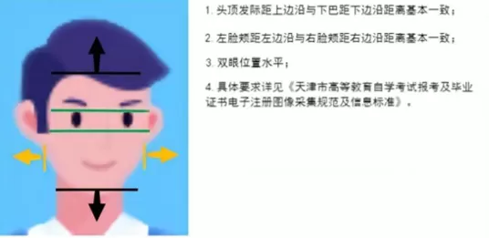 一、考生登录 考生登录“招考资讯网”(www.zhaokao.net),点击“自学考试”进入“天津市高等教育自学考试考生服务平台”操作流程见下图: ![]() 二、身份认证 1. 报名照片(近期免冠照) (1)近期免冠浅蓝色(参考值RGB<100,197,255>)底彩照,JPG格式,示例见下图: ![]() (2)照片大小为20—40KB,分辨率300dpi,照片高度为640像素,宽度为480像素。