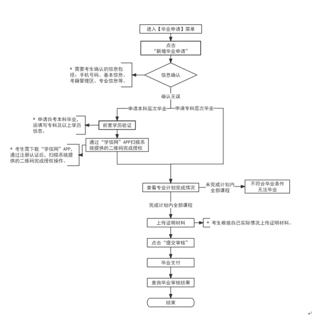 ![]() (3)身份认证上传的证件照作为考生存档照片,将用于准考证打印及其他各项业务办理,须符合《天津市高等教育自学考试报考及毕业证书电子注册图像采集规范及信息标准》(详见附件),不符合要求的照片将不能通过认证。 ![]() 2. 本人身份证照片 (人像面) (1)身份证字体清晰, 四个圆角完整,大小为 20—80KB。 (2)图片禁止拉伸或变形, 图片拉伸或变形,可能认证失败。 3. 注意事项 考生不能修改身份证号、姓名、性别、民族等关键信息,如有错误,请考生联系所属考籍管理区提出申请并进行现场确认。 三、办理时间 2024年12月9日至11日(系统提供服务时间为每天8:30至21:00),11日后系统毕业申请功能关闭,该项业务停止办理。 四、办理条件 1.考生须专业计划课程考试成绩全部合格(包括:省际转考成绩、课程免考等成绩。 2.考生在申请毕业时个人信息要保证准确无误(包括姓名、身份证号、性别、出生日期等),如有变动或错误须及时联系所属考籍管理区提出申请并进行现场确认。 3.考生申请本科毕业证书,须持有专科或专科以上毕业证书。 4.专科毕业证书与本科毕业证书不能在同一申请时间批次办理。 五、办理流程 ![]() 六、所需材料 1. 申请本科毕业的考生需下载“学信网”APP,注册认证后,扫描“天津市高等教育自学考试考生服务平台”提供的二维码完成授权操作。若授权失败或未完成学信网认证,考生可手动点击“已完成授权”,进入下一步,上传相关材料。 ![]() 2.申请本科毕业的考生如前置学历验证授权失败或未通过“学信网”认证,需上传“学信网”下载的有效期内专科及以上“学历电子注册备案表”(PDF格式)或“中国高等教育学历认证报告”(JPG格式;照片大小为50—500KB;请确保所上传的照片清晰)。 3.若现用名与原学历姓名不一致,需上传公安机关出具的姓名更改证明照片(JPG格式;照片大小为50—500KB;请确保所上传的照片清晰)。 七、重要提示 1.为维护考生利益,新专业课程计划启用后,考生原合格课程的成绩继续有效,可按照《天津市高等教育自学考试各新旧专业课程计划替代方案》进行课程替代。 2.对开考专业在籍未毕业的考生设立两年过渡期(从2024年1月1日开始至2025年12月31日截止)。过渡期内,考生可根据已合格课程情况,自主选择按新专业课程计划或旧专业课程计划申请毕业。《天津市高等教育自学考试各新旧专业课程计划替代方案》实行双向替代。毕业证上的专业名称均使用新专业名称。 3.根据“津价费(2001)244号”文件规定,申请毕业的考生网上须交纳考试成绩复查费56元。 4.本次毕业证书将于2024年12月30日开始陆续邮寄发放,有关毕业证书邮寄事宜可于工作时间拨打邮政客服电话:27353889或速递业务服务电话:11183。 5.请考生确保系统中登记的手机号码准确无误,并保持通讯畅通,以便我们在邮寄过程中能够及时与您取得联系。 6.领取毕业证书后,考生需将“毕业审批登记表”交由单位人事档案管理部门存档。 7.毕业审核工作结束后,市自考办将按照教育部教育考试院规定的时间上传毕业生数据。考生或用人单位可以通过“中国高等教育学生信息网”(www.chsi.com.cn)查询。 8.申请学位的考生,请于毕业申请前主动联系本专业主考院校,了解该专业的学位授予标准及要求。 附件:高等教育自学考试报考及毕业证书电子注册图像采集规范及信息标准
