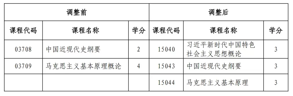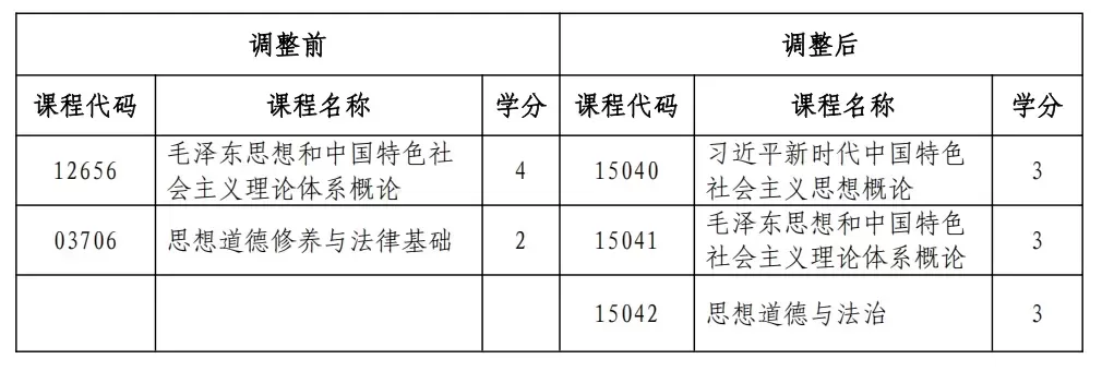 调整后,我省自学考试专科、本科层次各专业思想政治理论课均设置3门课程,共9学分。调整变化如表所示: