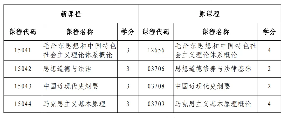 在籍未毕业的考生,其已取得的思想政治理论课程合格成绩及学分继续有效。已取得现行的“毛泽东思想和中国特色社会主义理论体系概论”(12656,4学分)、“思想道德修养与法律基础”(03706,2学分)、“中国近现代史纲要”(03708,2学分)、“马克思主义基本原理概论”(03709,4学分)等4门思想政治理论课程合格成绩和学分的考生,可对应顶替调整后的思想政治理论课程,无需再参加调整后的相对应课程考试。课程对应顶替关系如表所示: