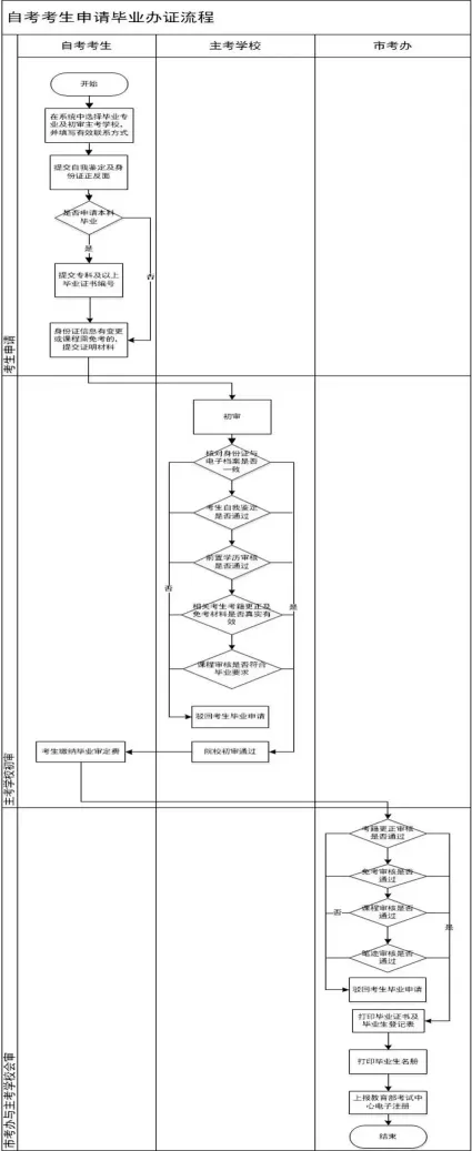 考生持本人有效身份证到主考学校自考办或通过高等教育自学考试重庆市信息管理系统申请毕业,并按以下步骤提交相关材料。