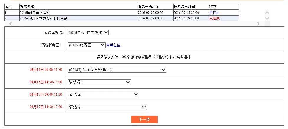 5.选择对应堂次的课程,不报考该堂次不选择即可。报考完成,点击下一步。