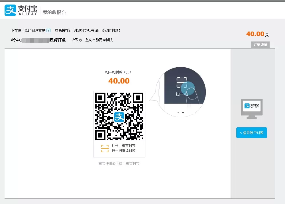 10.支付注意事项:网上报考截止时间前,完成网上交费,否则视为自动放弃。缴费完成,报考课程不能再更改。系统跳转到支付宝页面并输入支付宝账号密码后后,若未完成支付,订单将在3小时后关闭;若需要重新缴费或者更改报考课程,请于3小时后重置后再操作。